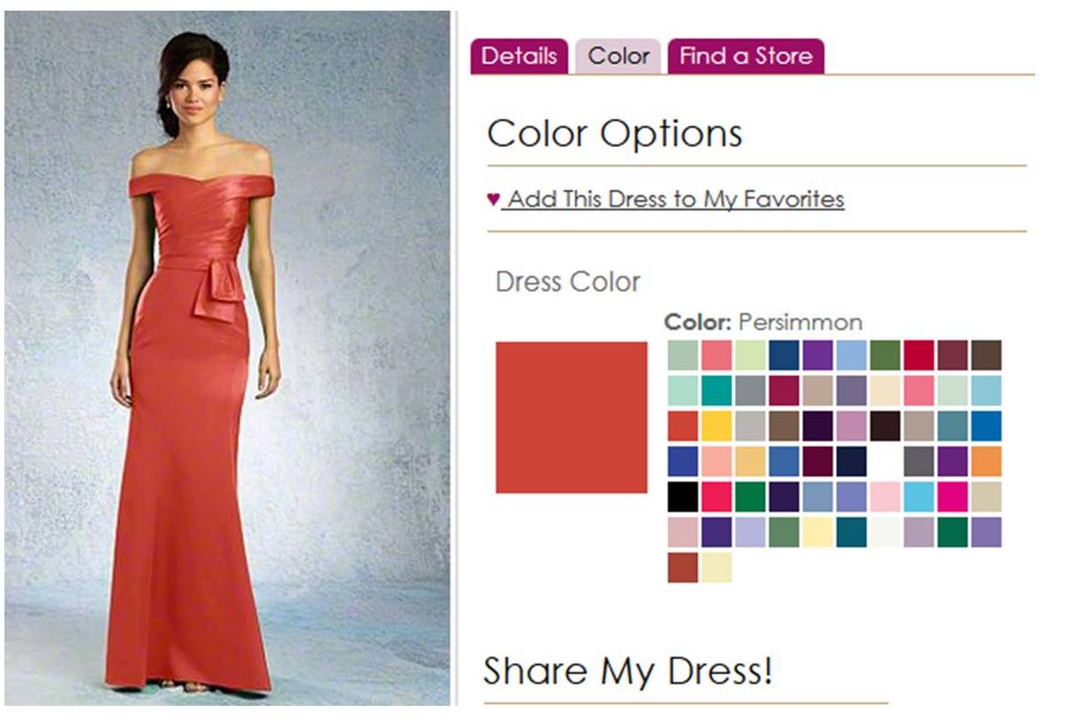 If you haven’t discovered it yet, here’s a fun and easy way to pick your gown colors. Try the customizing tool provided online by several design houses that lets you take a peek at both style and color. Choose from hundreds of gowns in both long and short designs and then pick your color by scrolling over the color chart (more than 60 shades on Alfred Angelo). Have fun! Click here for Alfred Angelo. Here for Watters.