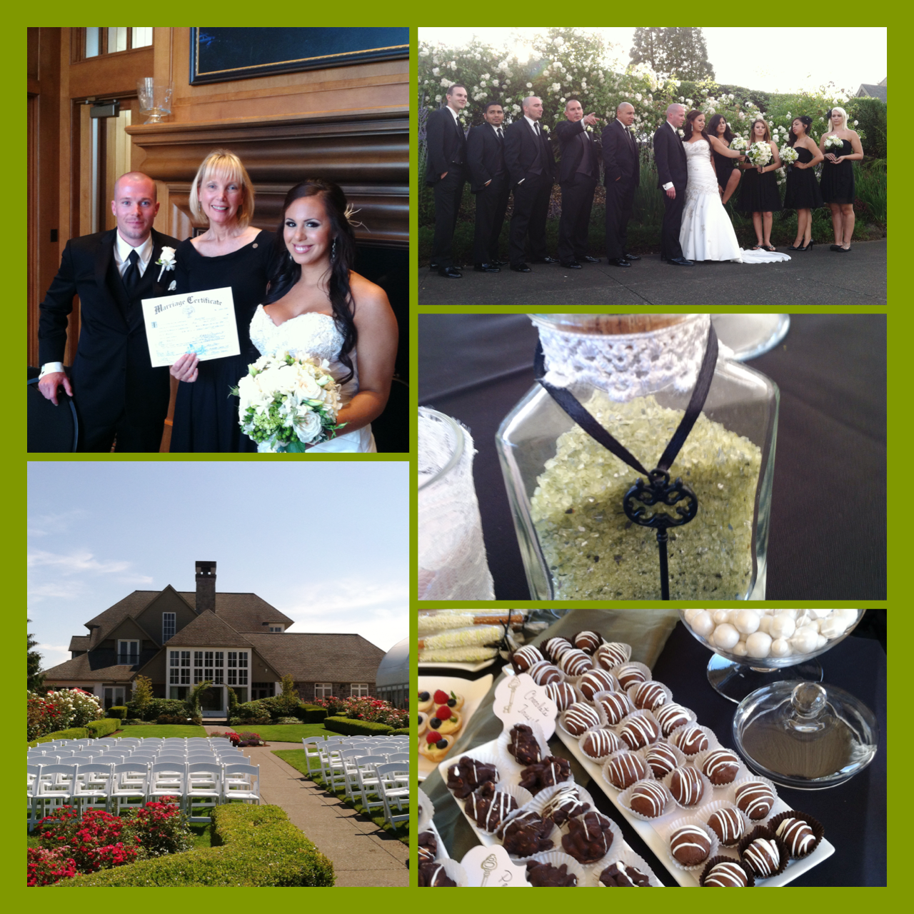Black, white and peridot were the colors chosen to create the sophisticated fun of yesterday’s wedding at the Oregon Golf Club in West Linn. The ceremony was held in the scenic rose garden under sunny skies. Romantic violins provided the program music as Natalie and Jonah became husband and wife. As a symbol of unity, the newlyweds placed their vows in a keepsake box and locked it with a key. Both the key and the box will have a place of honor in their home. After the ceremony, guests enjoyed drinks on the veranda before dining on grilled salmon, beef sirloin, asparagus and wedges of butter leaf lettuce dressed with gorgonzola and bacon. A cold seafood bar featured crab legs, jumbo shrimp and oysters on the half shell. A highlight of the reception menu was the elaborate sweets table that included handmade truffles, fruit tarts and white chocolate skeleton keys. Congratulations, Mr. & Mrs. Nelson. May life hold nothing but beautiful vistas for you both!