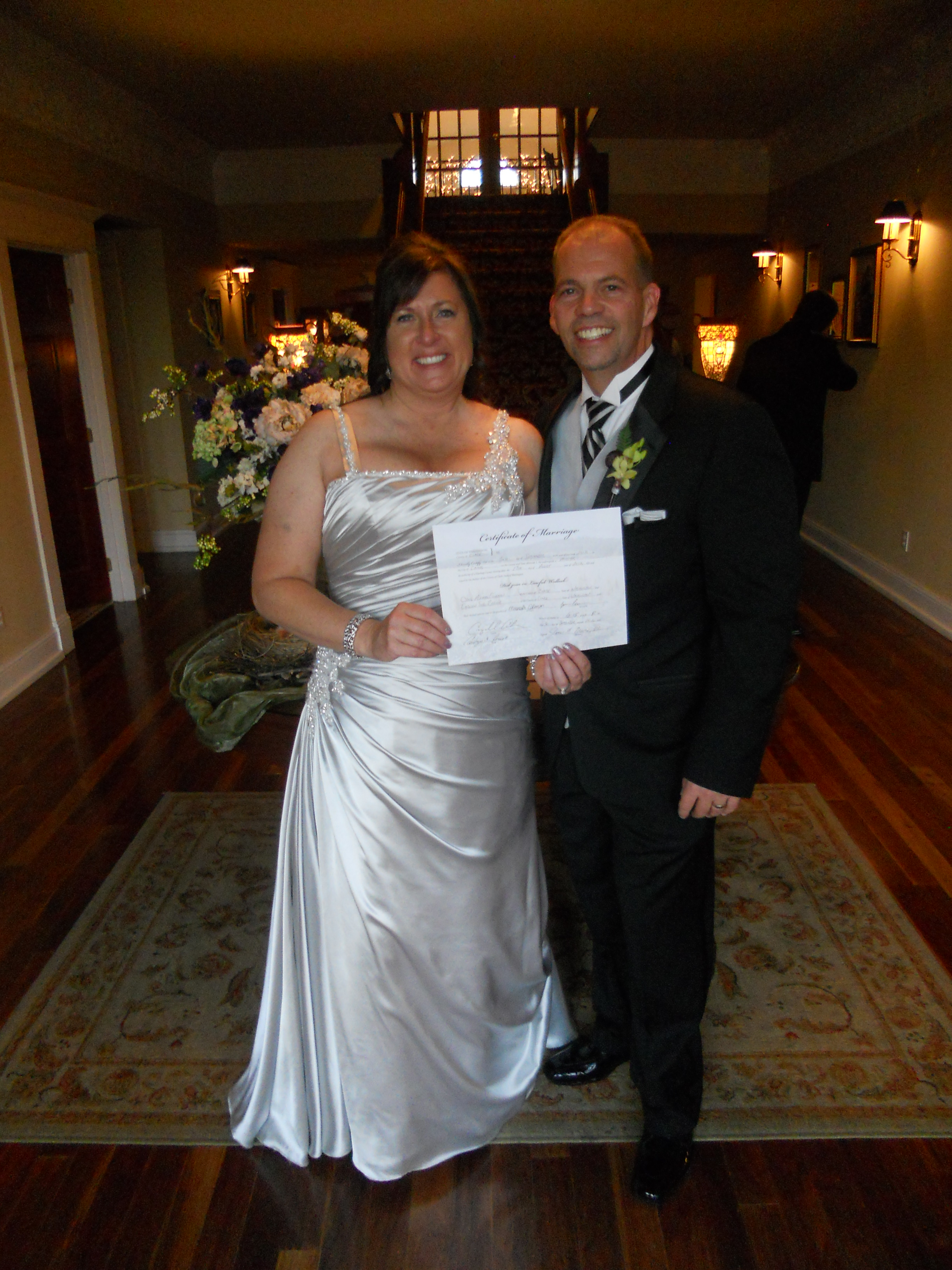 Loved ones gathered under sunny skies last Saturday to witness the wedding of Michelle and Rudy. Friends in Anacortes when they were ten years old, fate took them in different directions until they reunited in 2003. The couple exchanged vows on the gazebo deck of their new home which is nested in a beautiful old growth green space in Mt. Vernon. The bride entered to Mendelssohn’s Wedding March escorted by her twin sons and was presented to the groom by both the boys and the couple’s two daughters. The ceremony featured a tree planting ritual and tribute roses presented to both moms. DJ Keenan provided music for both the ceremony and the reception. Guests enjoyed a backyard banquet topped off by an elaborate wedding cake with fountain and stairs; and hand dipped strawberries. The newlyweds are relaxing at home this week enjoying visiting family from New Mexico. Congratulations, Mr. & Mrs. Diaz! May your married life be filled with health, happiness and all the laughter your hearts can hold.
