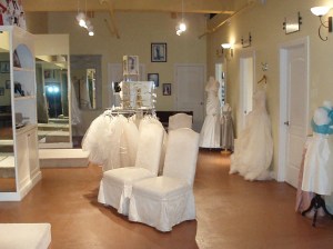 One flight up and down the hall – beautiful gowns await you. You’d never guess from the unassuming exterior on NW 17th that such splendor exists – so close yet a world apart from the Glisan traffic. Divine Designs has created an intimate and lovely experience for the bride to be and her lucky shopping companions. Terra cotta walls and arched doorways, comfortable seating and spacious rooms and we haven’t even gotten to the dresses yet! Bridal gown experts personally guide you through the selection process bringing out breathtaking choices one by one from their magical backroom. It’s such a better way to view gowns – much less overwhelming than trying to wade through a sea of satin on your own.